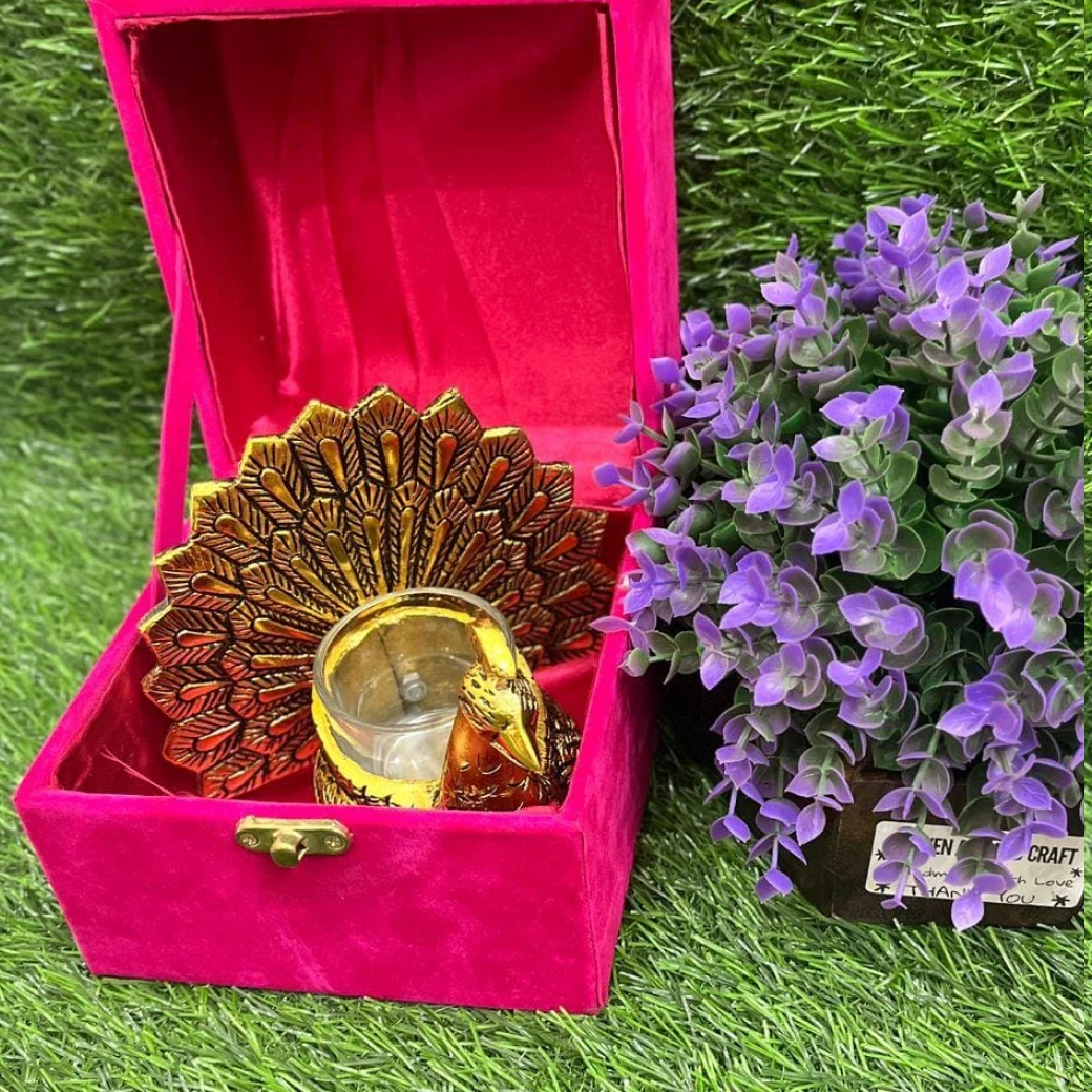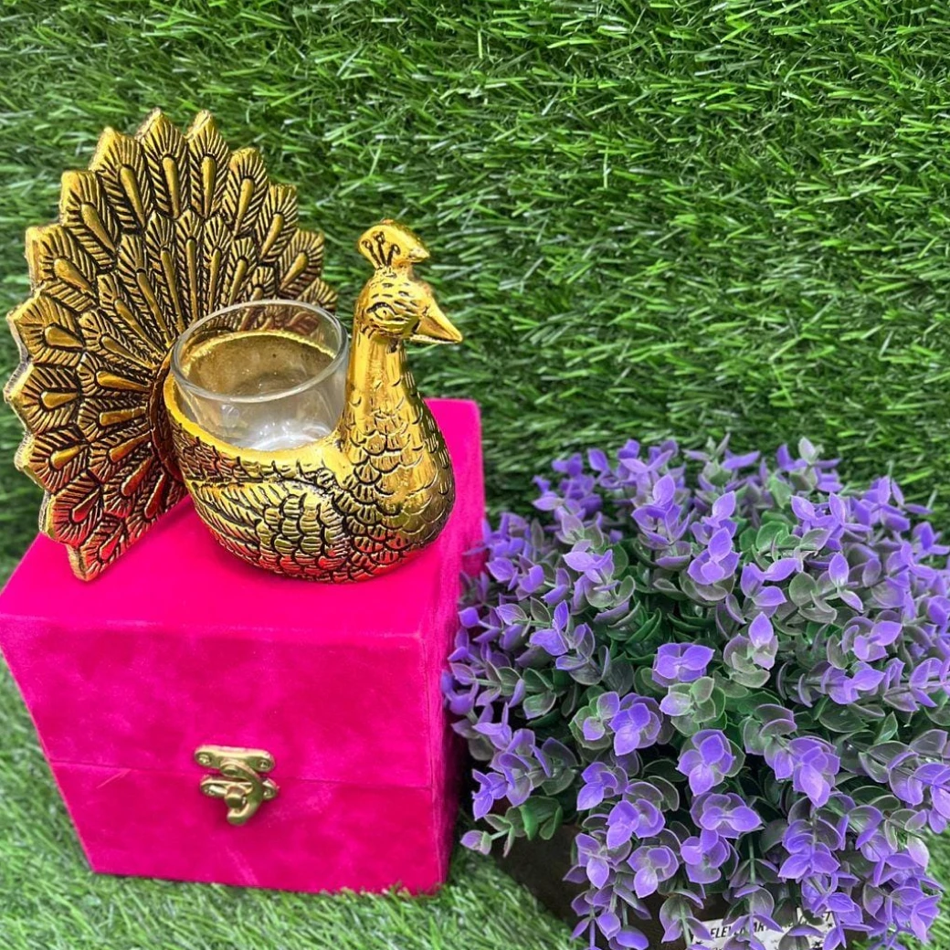 Designed to stand out, this antique German golden peacock feather set includes a votive candle neatly placed in a premium velvet box. The golden finish gives it a rich and festive look, making it ideal for special celebrations. Suitable for décor or gifting, it works beautifully as return gifts for weddings, engagements, housewarming events, and festive functions. A refined gift that adds warmth and elegance.