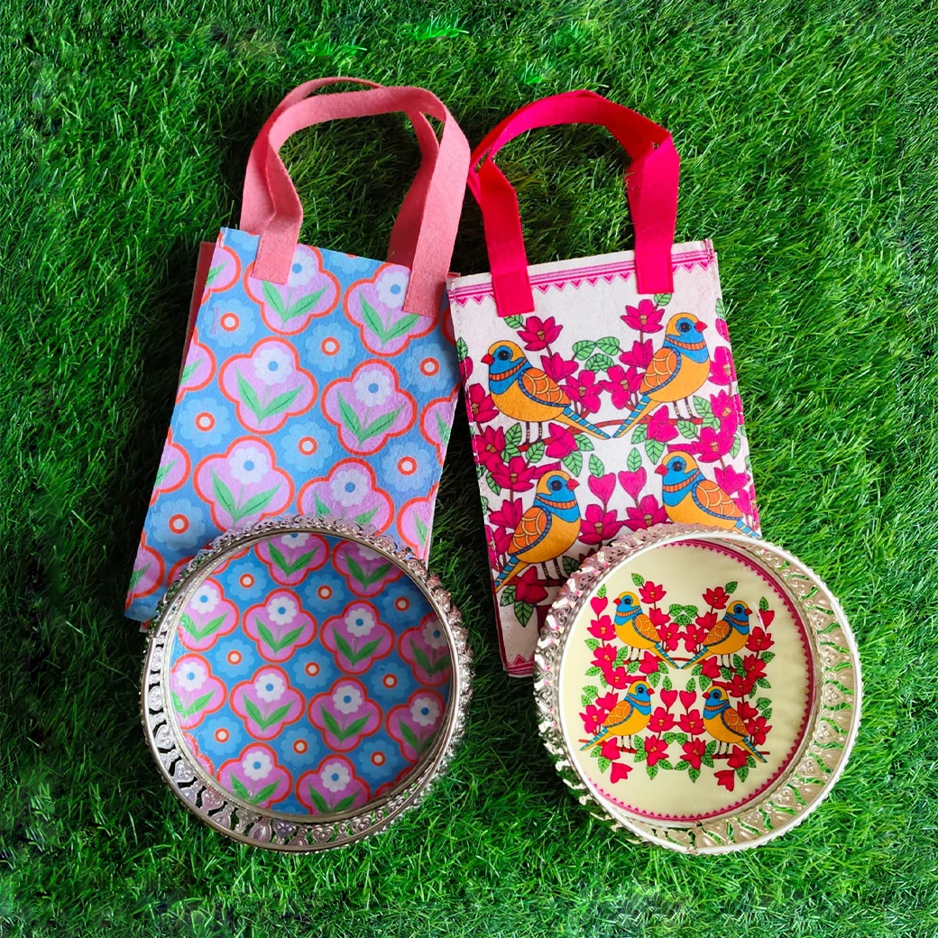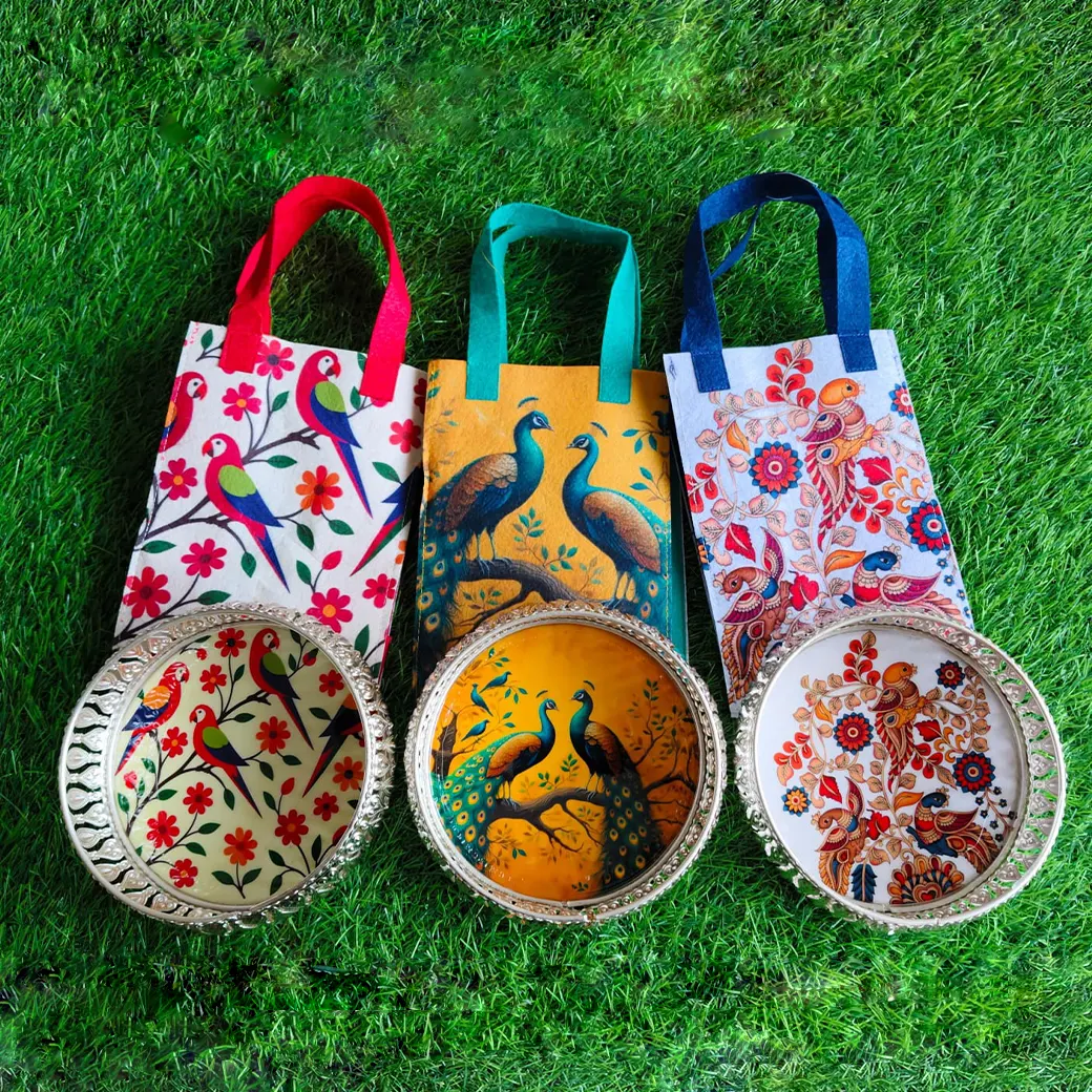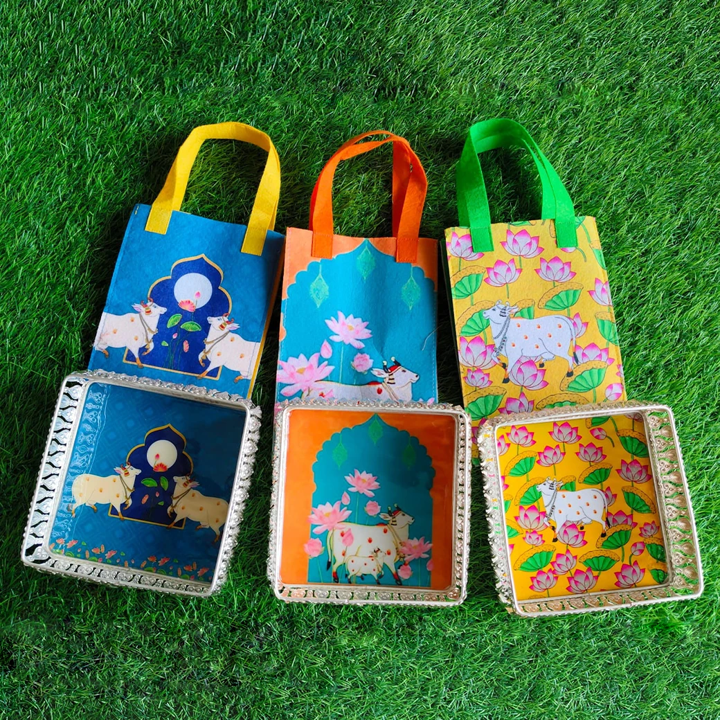 This elegant combo features a German silver coated metal trays with beautiful digital Pichwai prints, paired with a matching felt bag. The tray adds a festive touch, while the bag makes it easy to carry and gift. A stylish and useful option for wedding, engagement, and housewarming return gifts that your guests will truly appreciate.