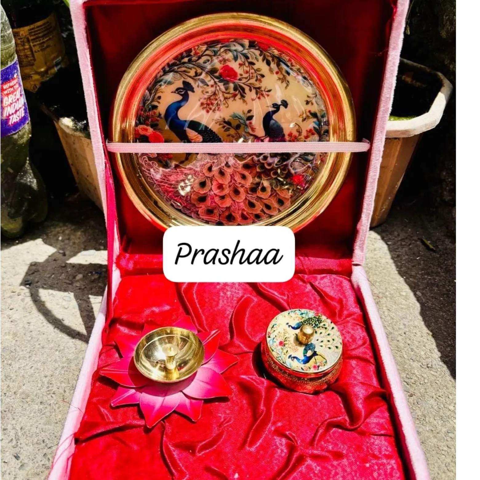 Light Yellow Brass Plate Combo Box with including Sindoor Box and Red Flower Diya