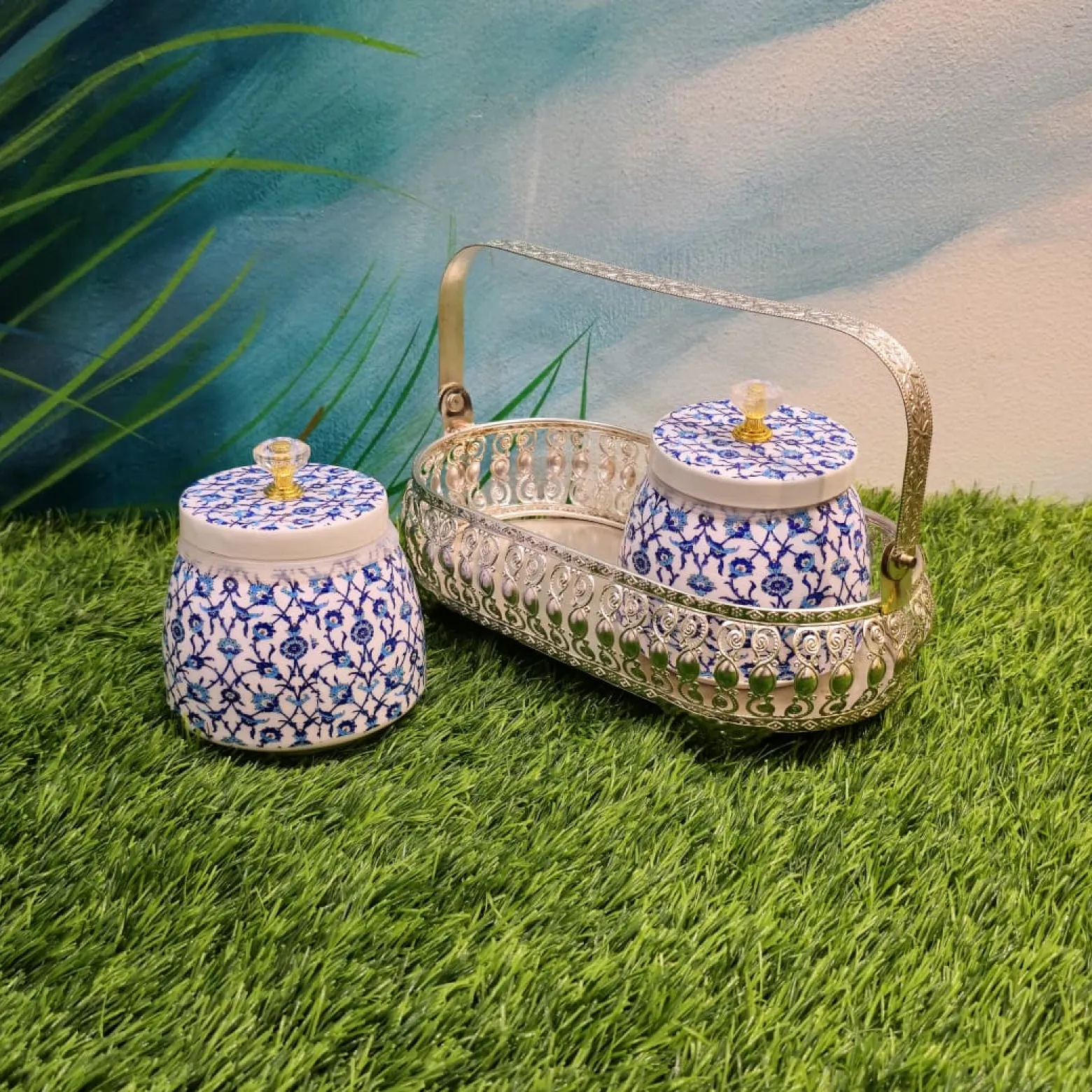 Metal Basket With Blue Floral Jars In German Silver Finish
