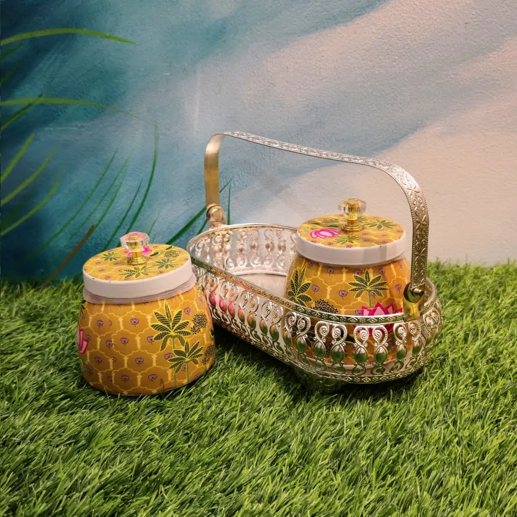 Bright and festive, this metal basket with dark yellow floral jars comes in a rich German silver finish. Sized at 8.5 x 4.5 x 2 inches, it works perfectly for packing dry fruits or sweets. Its cheerful look makes it ideal for wedding return gifts, festive functions, and traditional celebrations. Customisation options are available.