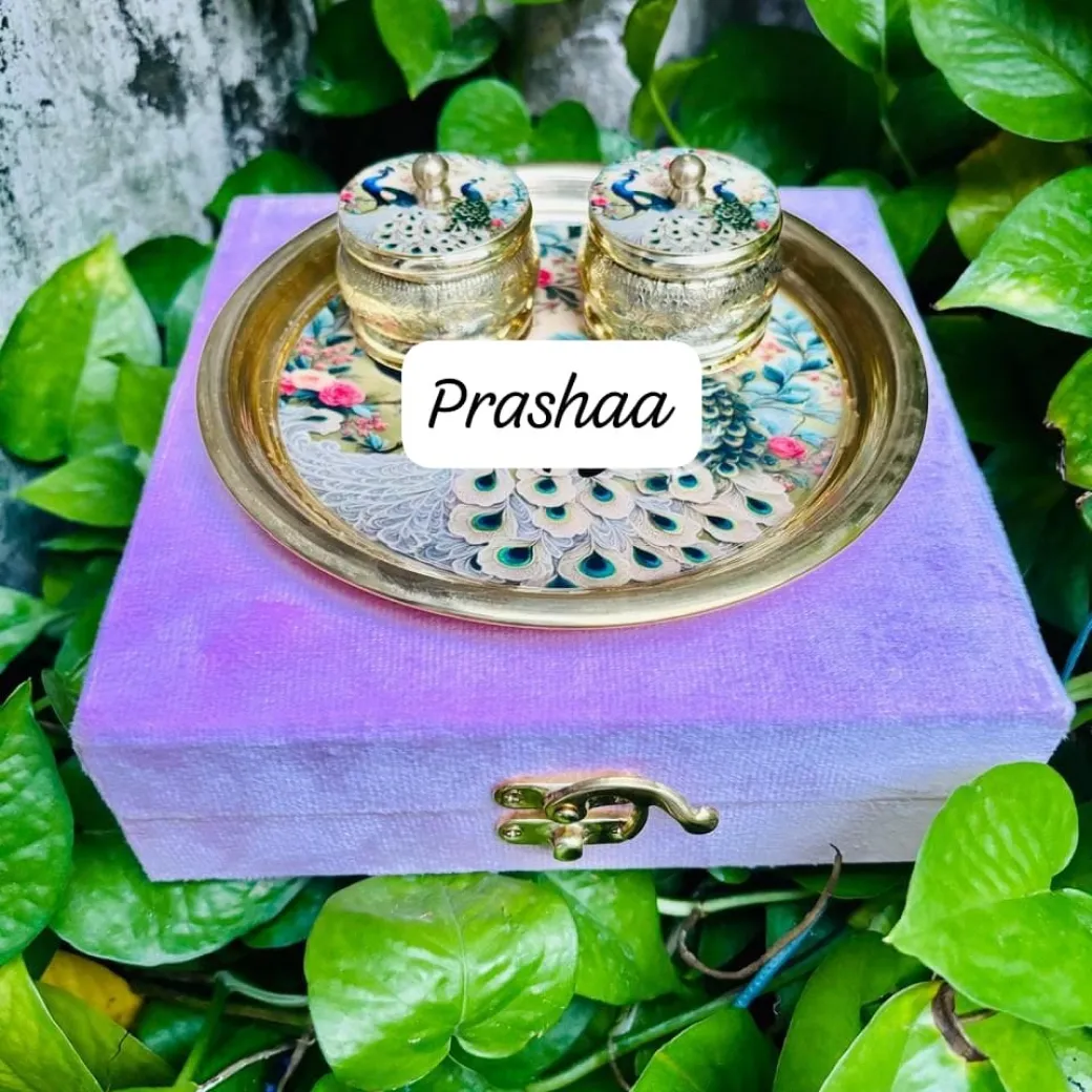 Add a rich and festive touch to your gifting with this Purple Brass Plate Combo Box, complete with two sindoor boxes. The deep purple shade brings a royal feel, while the brass finish keeps it traditional and timeless. This elegant set is a lovely option for return gifts, suitable for weddings, baby showers, housewarming functions, and engagement celebrations. A graceful keepsake your guests will love to take home.