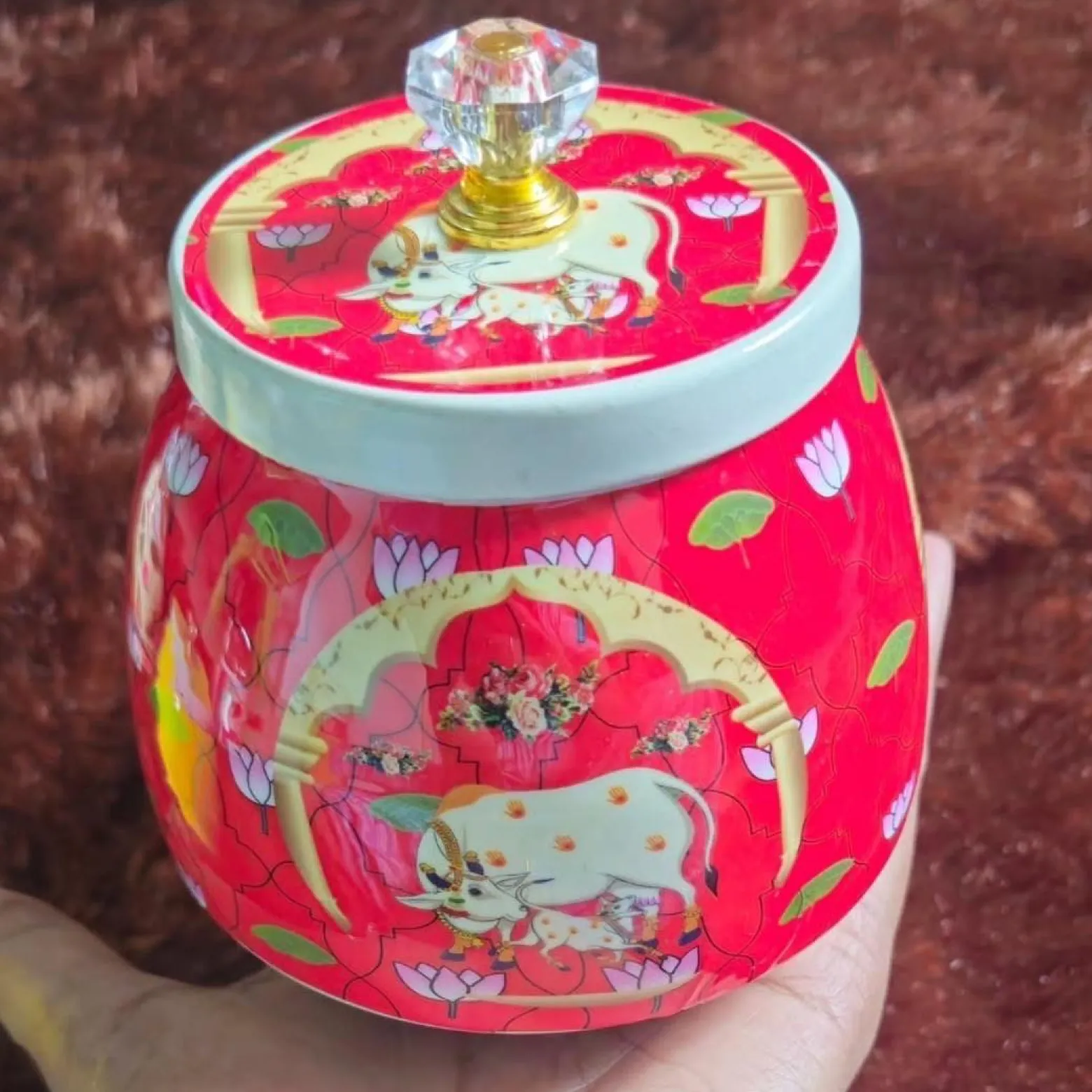 These Red Pichwai Jars with Cow design bring a bold and festive feel to your gifting. With rich colours and detailed artwork, they are perfect for small treats or décor use. A wonderful choice for engagement, baby shower, and festive return gifts.