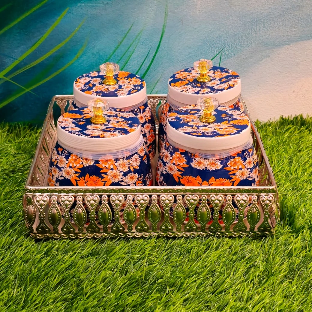 Rich dark blue floral jars combined with German silver trays give this set a royal and premium look. Designed for serving sweets or adding elegance to décor, it also works wonderfully as return gifts for weddings, housewarming functions, and traditional celebrations. Print and size can be customised to match your theme.