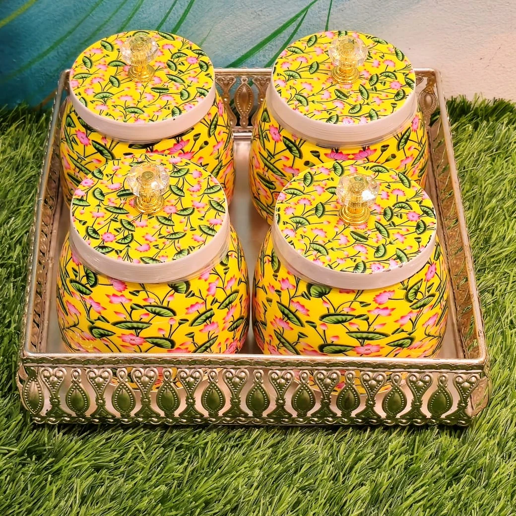 Light yellow floral jars paired with silver-finished trays bring a cheerful and fresh look to this gifting set. It feels warm, festive, and easy to match with any occasion theme. A lovely option for baby shower return gifts, pooja gatherings, and housewarming functions. Print and size can be customised as needed.