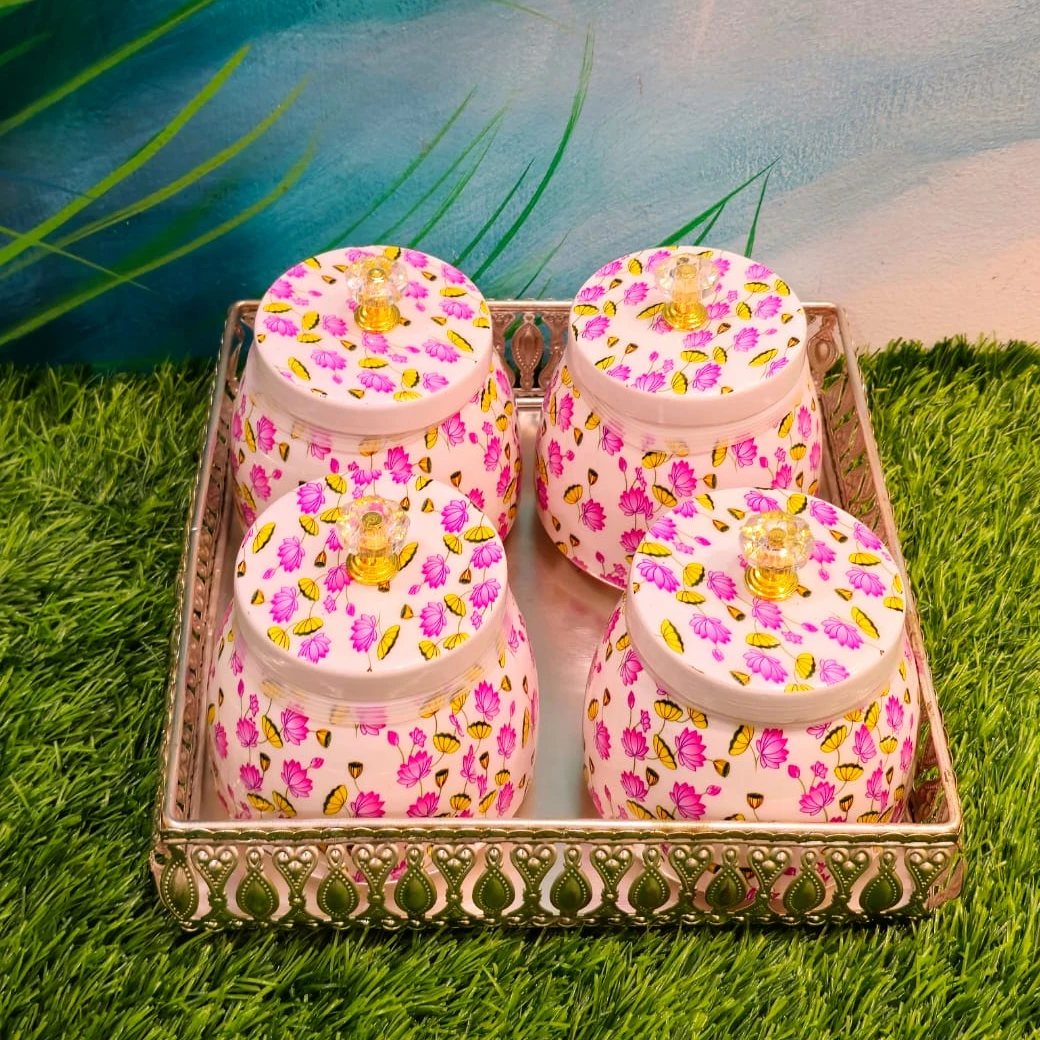 Clean, soft, and elegant, this set of German silver trays with white floral Pichwai jars looks timeless and graceful. Perfect for serving, décor, or festive gifting, it suits both modern and traditional celebrations. A beautiful pick for wedding return gifts, engagement functions, and classy festive events. Custom print and size options are available.